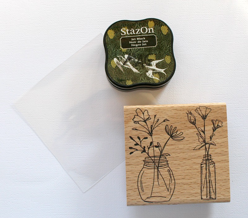 Tamponnez le rhodoïd avec la StazOn et le cardstock avec la Versafine en écrasant bien votre tampon pour obtenir une impression nette sur le côté texturé de votre papier.